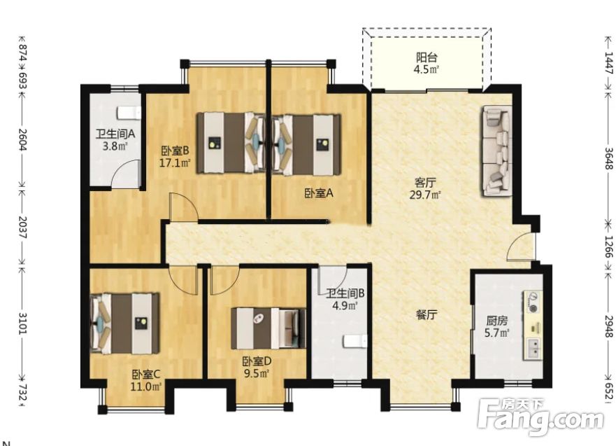 户型:方正户型4房2厅2卫;
